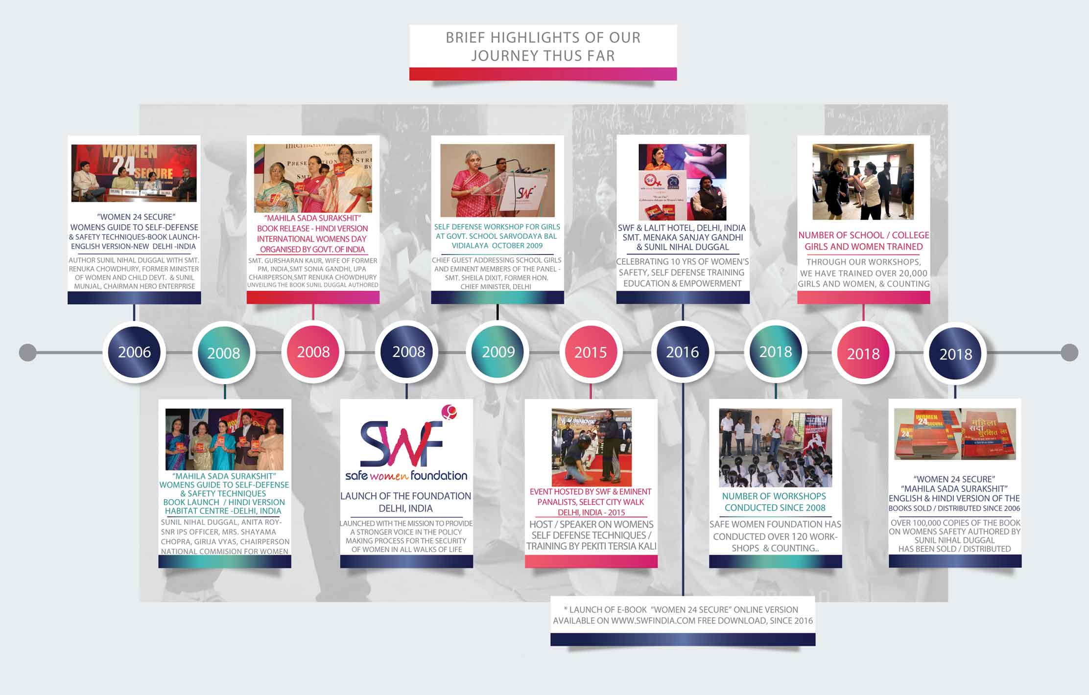 In 2006, Sunil Nihal Duggal (Chairman, Twenty 4 Ventures Group Limited ) authored the book “Women 24 Secure”, a self-help guide for women to make intelligent safety decisions and to trust their instincts. Built on the same principles, Sunil Nihal Duggal founded Safe Women Foundation (SWF). Shri Vinod Duggal, Former Union Home Secretary, and Governor have recently agreed and become Parton of the foundation. Ms. Suruchi Duggal is the Secretary-General of the foundation. The members of its governing body are eminent persons of the country who have proven credentials and are well known for their commitment to the cause of women.